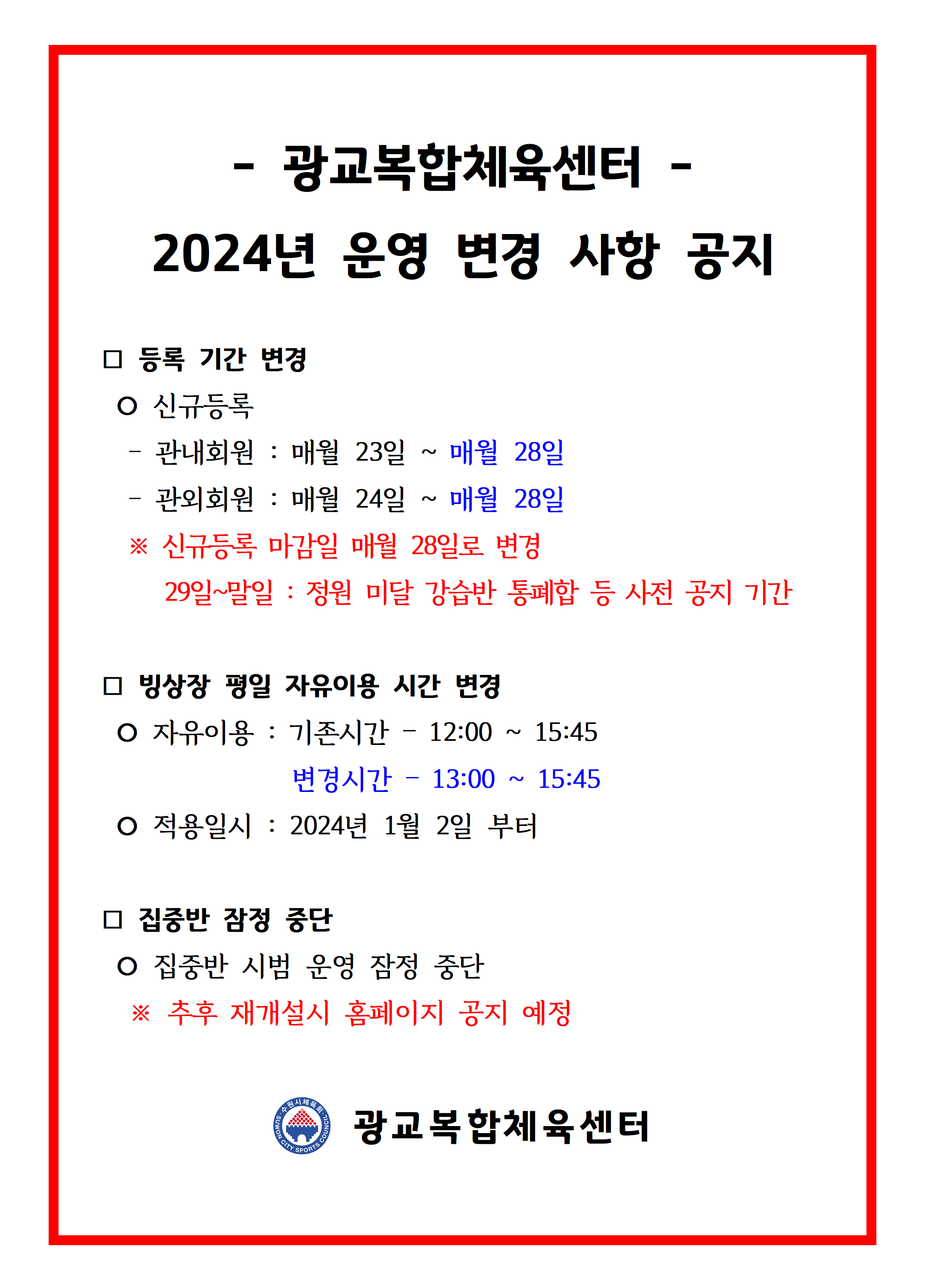 광교복합체육센터 2024년 운영 변경 사항 공지 작성자 관리자 등록일자 2023년 12월 18일 11시 13분 23초 조회 3,121 2024년 운영 변경 사항 공지.png [ Size : 244.25KB , Down : 4,025 ] 미리보기 다운로드 목록보기