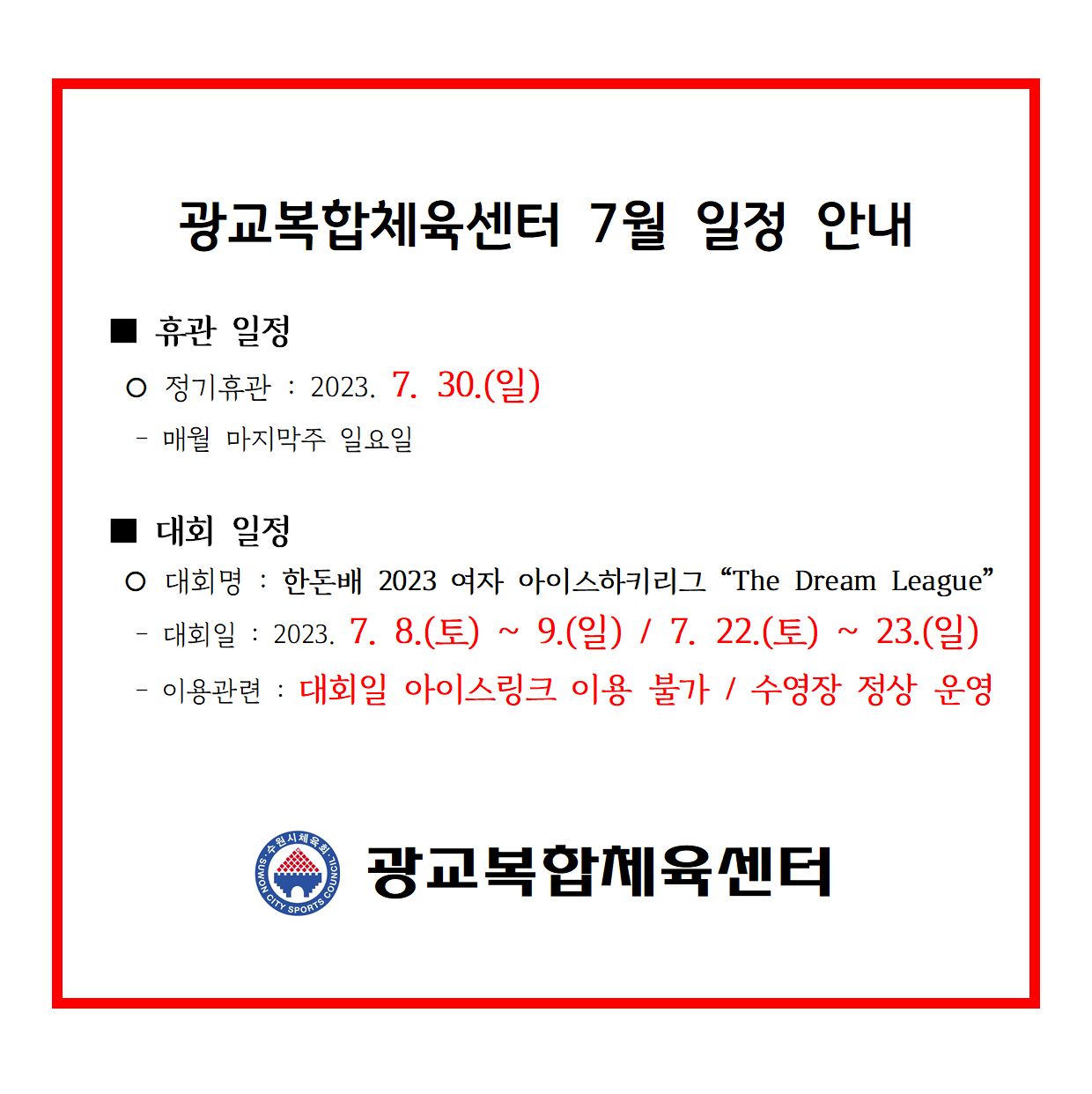 광교복합체육센터 7월 일정(휴관) 안내 작성자 관리자 등록일자 2023년 6월 26일 9시 25분 19초 조회 3,110 7월 일정(휴관) 공지.png [ Size : 74.15KB , Down : 3,595 ] 미리보기 다운로드 목록보기