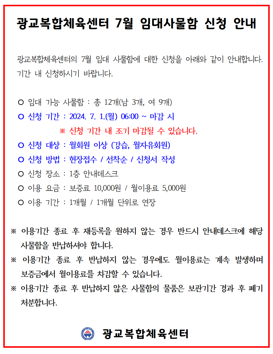 광교복합체육센터 2024년 7월 임대사물함 신청 안내(수정안내) 작성자 관리자 등록일자 2024년 6월 26일 18시 7분 0초 조회 1,183 7월 임대사물함 신청 안내001.png [ Size : 108.85KB , Down : 1,054 ] 미리보기 다운로드 목록보기