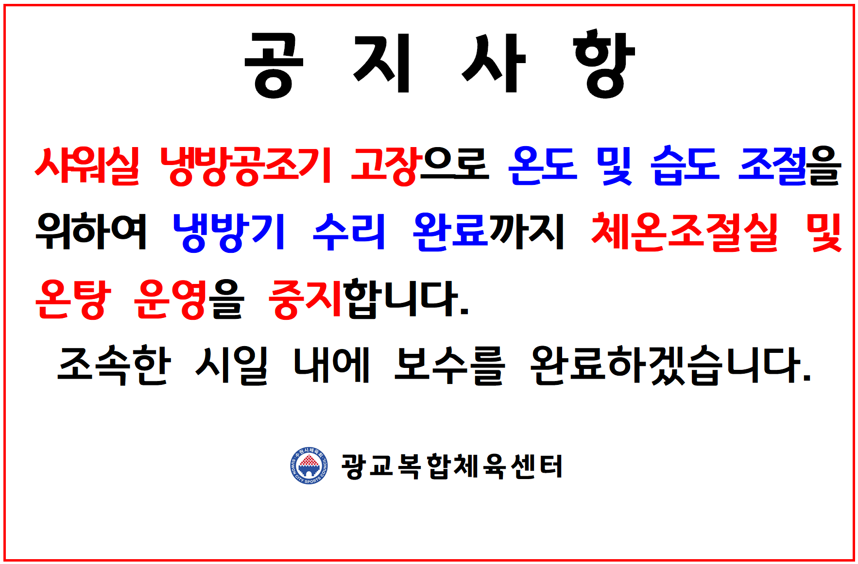 광교복합체육센터 수영장 온탕 및 체온조절실 운영 중지 안내 작성자 관리자 등록일자 2025년 8월 21일 15시 6분 1초 조회 1,245 온탕보수 - 냉방기 고장001.png [ Size : 99.75KB , Down : 1,303 ] 미리보기 다운로드 목록보기