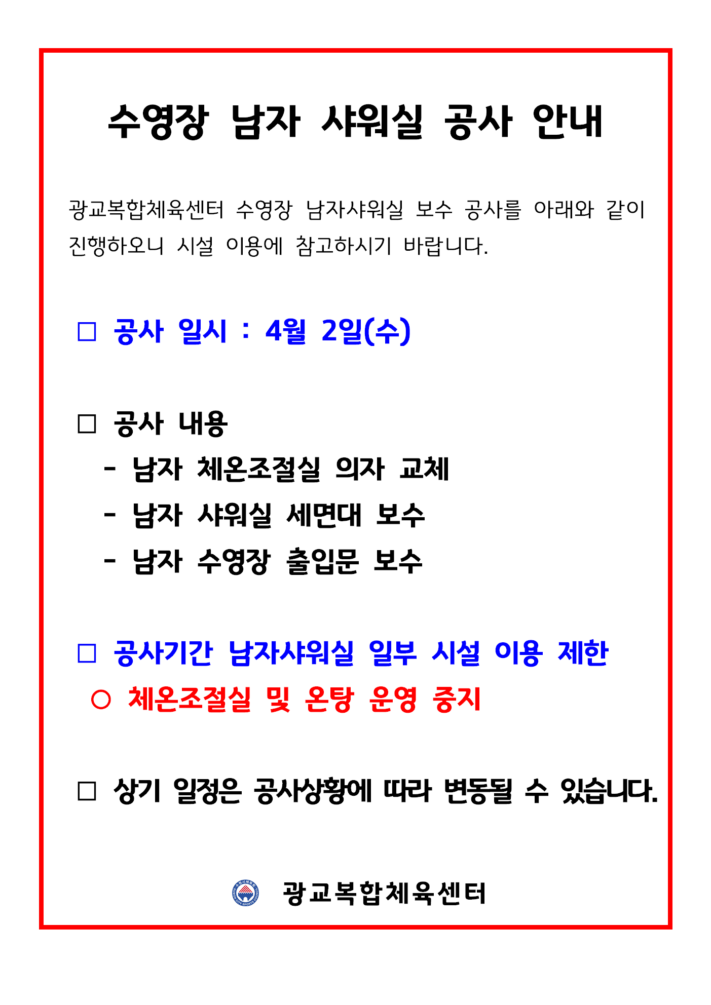 광교복합체육센터 수영장 남자 샤워실 공사 안내 작성자 관리자 등록일자 2025년 3월 27일 17시 40분 57초 조회 917 남자샤워실 공사 안내문001.png [ Size : 122.64KB , Down : 703 ] 미리보기 다운로드 목록보기
