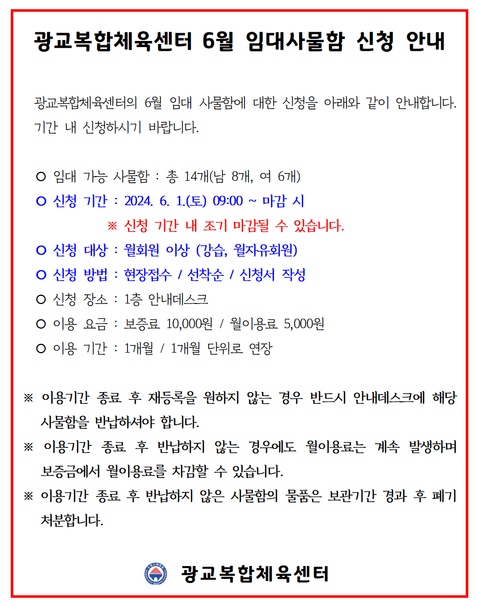 광교복합체육센터 2024년 6월 임대사물함 안내 작성자 관리자 등록일자 2024년 5월 29일 18시 16분 57초 조회 1,711 6월 임대사물함 신청 안내001.png [ Size : 109.16KB , Down : 1,611 ] 미리보기 다운로드 목록보기