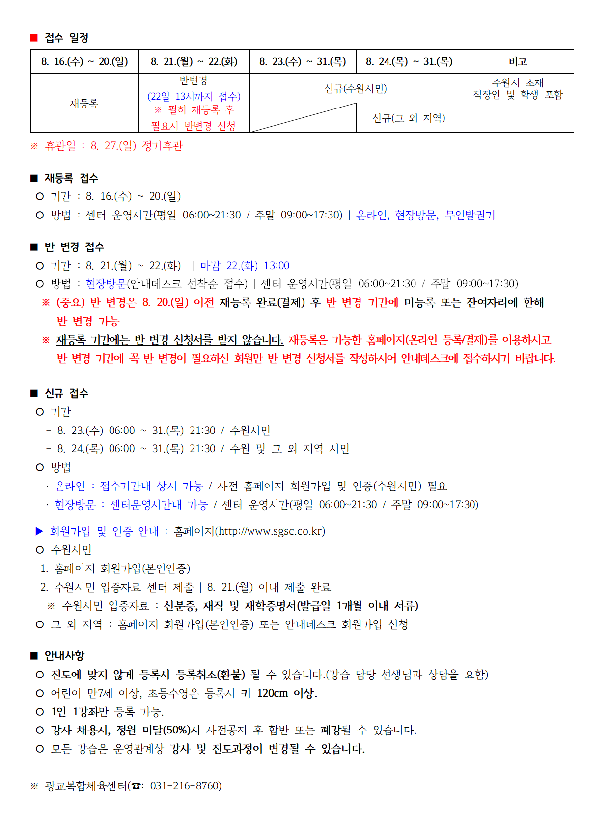 광교복합체육센터 9월 수영-빙상 진도표 공지 작성자 관리자 등록일자 2023년 8월 14일 17시 16분 57초 조회 6,137 9월 진도표001001.png [ Size : 263.64KB , Down : 4,765 ] 미리보기 다운로드 9월 진도표002.png [ Size : 218.21KB , Down : 4,710 ] 미리보기 다운로드 9월 진도표003.png [ Size : 161.3KB , Down : 4,585 ] 미리보기 다운로드 목록보기