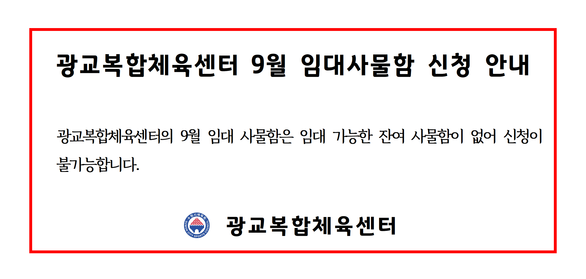 광교복합체육센터 2024년 9월 임대사물함 신청 안내 작성자 관리자 등록일자 2024년 8월 26일 10시 28분 37초 조회 1,176 9월 임대사물함 신청 안내001.png [ Size : 101.18KB , Down : 1,095 ] 미리보기 다운로드 목록보기