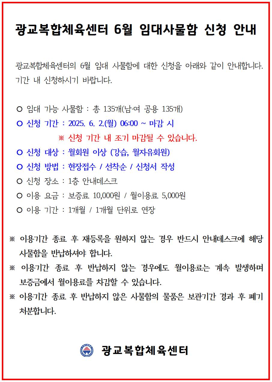 2025년 6월 임대사물함 신청 안내 작성자 관리자 등록일자 2025년 5월 21일 11시 0분 12초 조회 743 202506 임대사물함 신청 안내001.png [ Size : 106.47KB , Down : 803 ] 미리보기 다운로드 목록보기