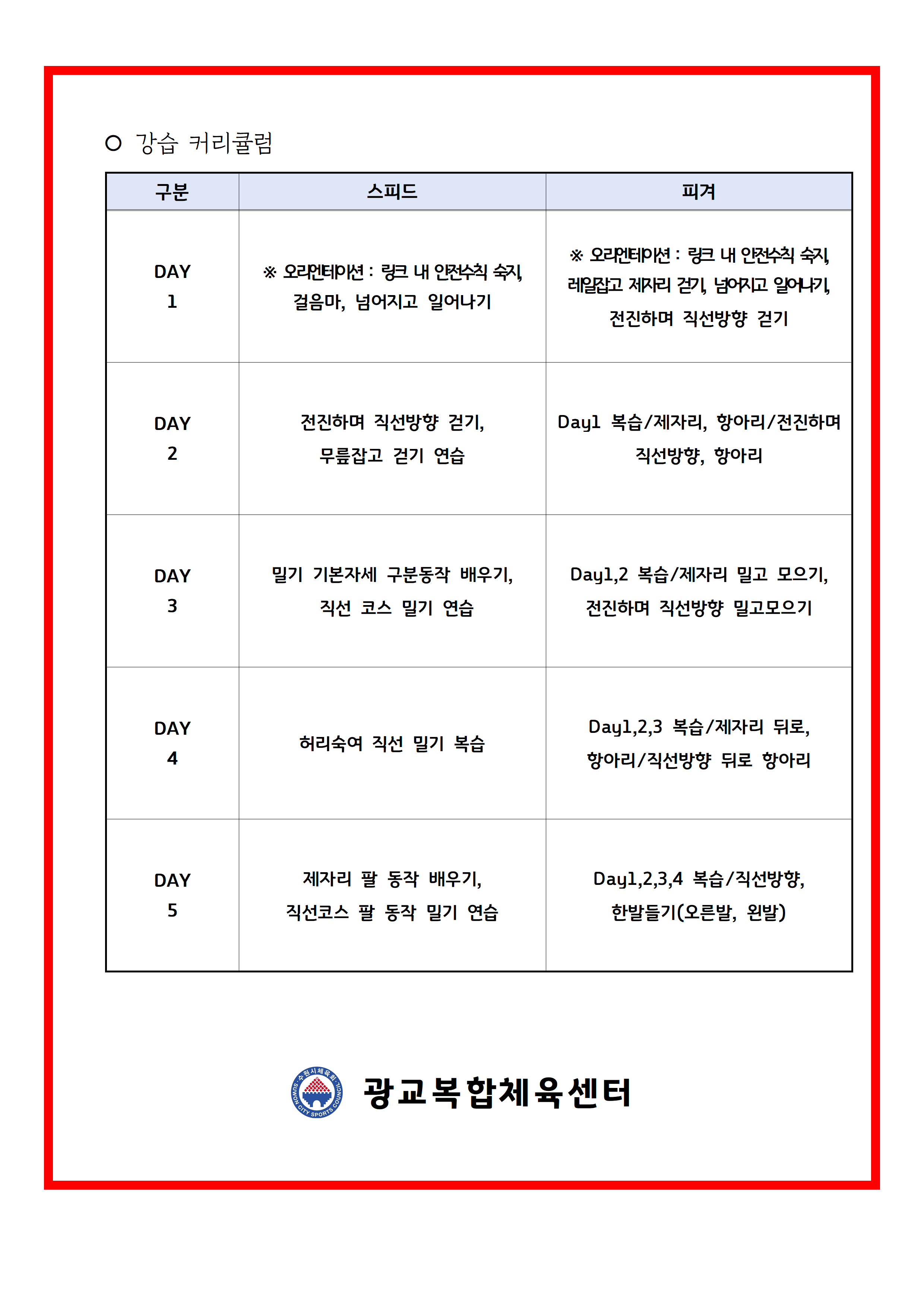 광교복합체육센터 빙상장 여름방학 특강 운영 공지 작성자 관리자 등록일자 2025년 7월 10일 13시 28분 53초 조회 2,521 250708_여름 방학 빙상 특강 공지001.png [ Size : 312.45KB , Down : 3,442 ] 미리보기 다운로드 250708_여름 방학 빙상 특강 공지002.png [ Size : 176.77KB , Down : 3,364 ] 미리보기 다운로드 목록보기
