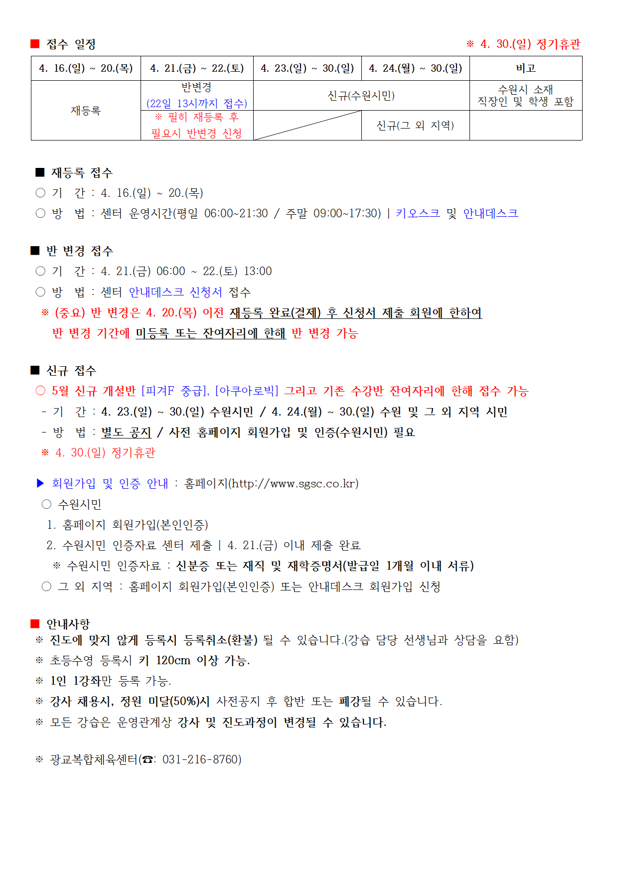 광교복합체육센터 5월 수영-빙상 진도표 공지 작성자 관리자 등록일자 2023년 4월 14일 17시 26분 53초 조회 2,628 2023. 05월_수영_빙상_진도표(공지)001.png [ Size : 203.08KB , Down : 2,412 ] 미리보기 다운로드 2023. 05월_수영_빙상_진도표(공지)002.png [ Size : 96.24KB , Down : 2,381 ] 미리보기 다운로드 image003.png [ Size : 112.6KB , Down : 2,246 ] 미리보기 다운로드 목록보기