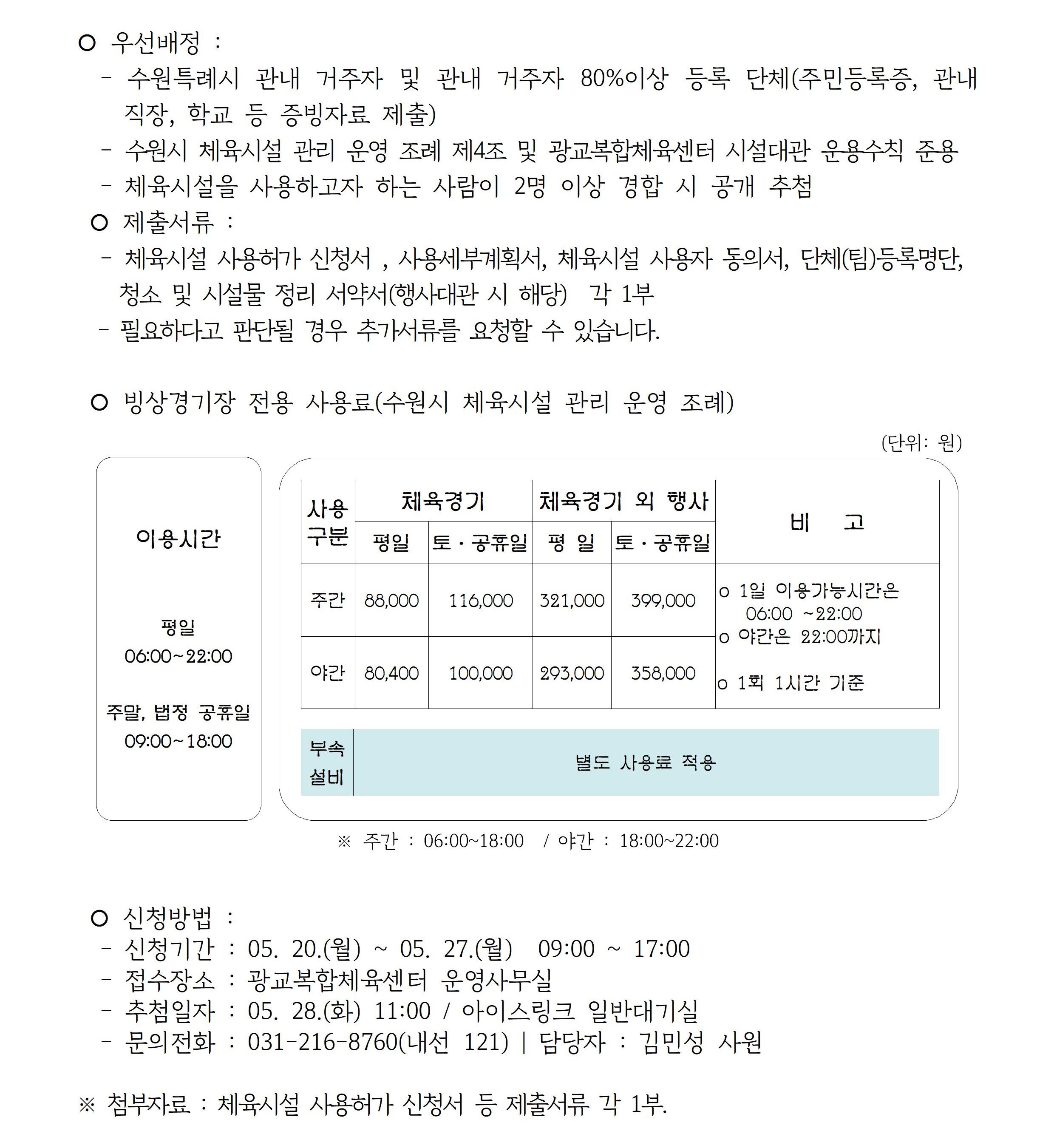 6월 아이스링크장 (수시)시범대관 공지 작성자 관리자 등록일자 2024년 5월 20일 9시 47분 50초 조회 1,328 ('24.06.) 아이스링크 수시대관_공지사항(공지용)001.jpg [ Size : 651.69KB , Down : 1,209 ] 미리보기 다운로드 ('24.06.) 아이스링크 수시대관_공지사항(공지용)002.jpg [ Size : 708.48KB , Down : 1,207 ] 미리보기 다운로드 아이스링크 대관_신청서.hwp [ Size : 265.5KB , Down : 497 ] 다운로드 목록보기