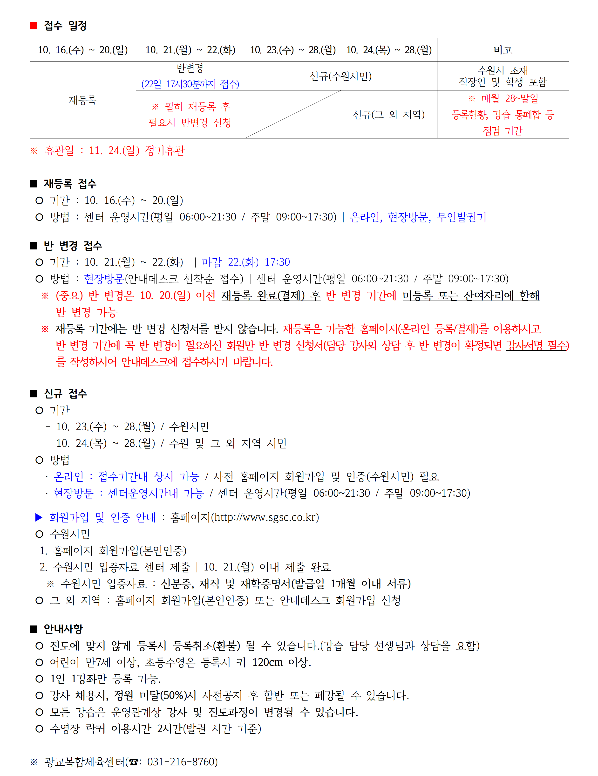 광교복합체육센터 11월 수영-빙상 진도표 공지