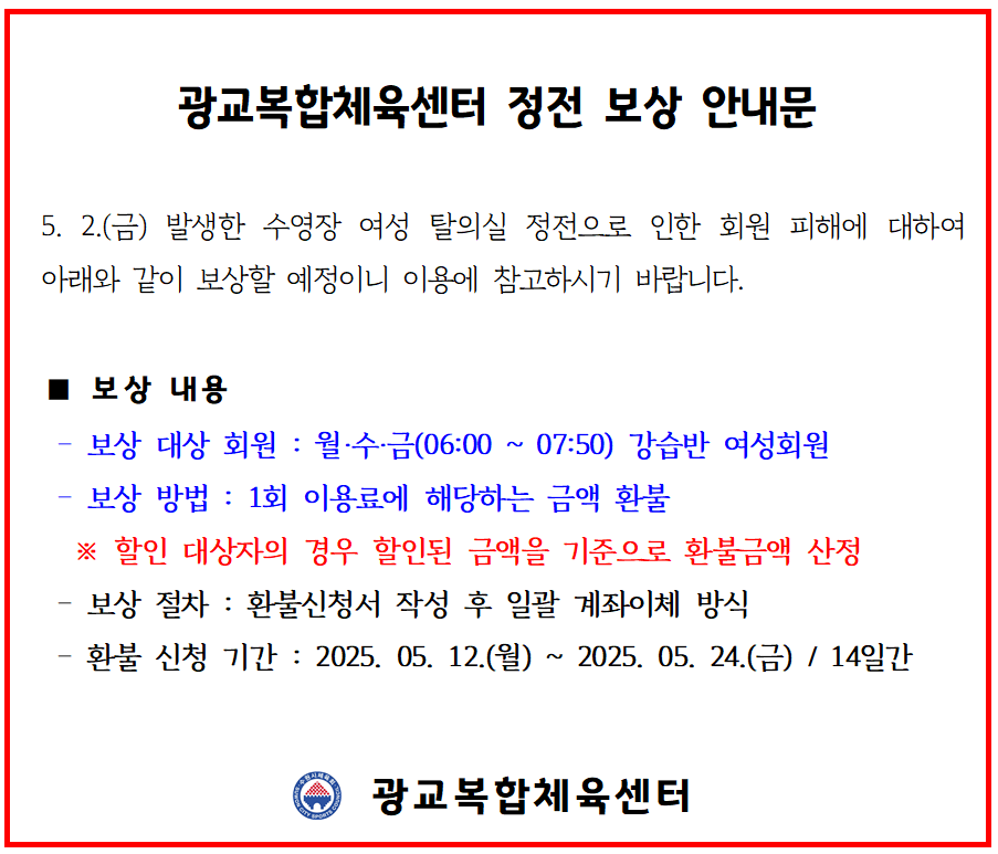 광교복합체육센터 정전(2025. 05. 02.) 보상 안내문 작성자 관리자 등록일자 2025년 5월 7일 15시 30분 24초 조회 971 20250507 정전 보상 안내문001.png [ Size : 64.06KB , Down : 870 ] 미리보기 다운로드 목록보기