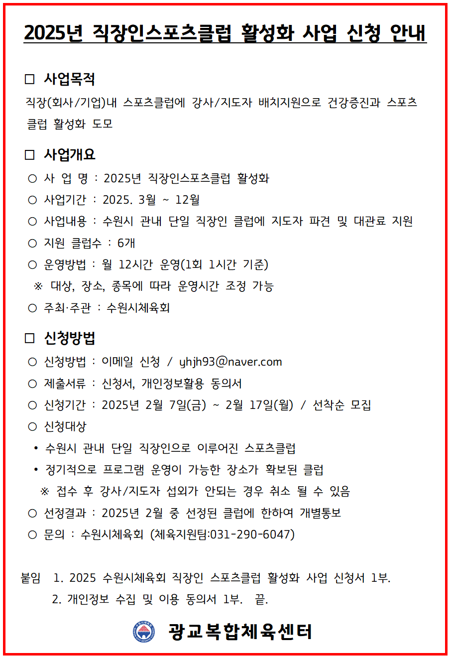 2025 직장인스포츠클럽 활성화 사업 신청 안내 작성자 관리자 등록일자 2025년 2월 7일 11시 19분 7초 조회 1,022 2025 직장인스포츠클럽 활성화 사업 신청 안내 - 체육지원팀001.png [ Size : 115.27KB , Down : 978 ] 미리보기 다운로드 (붙임1) 2025 수원시체육회 직장인 스포츠클럽 활성화 사업 신청서.hwp [ Size : 48.5KB , Down : 343 ] 다운로드 (붙임2) 개인정보 수집 및 이용 동의서.hwp [ Size : 62KB , Down : 358 ] 다운로드 목록보기