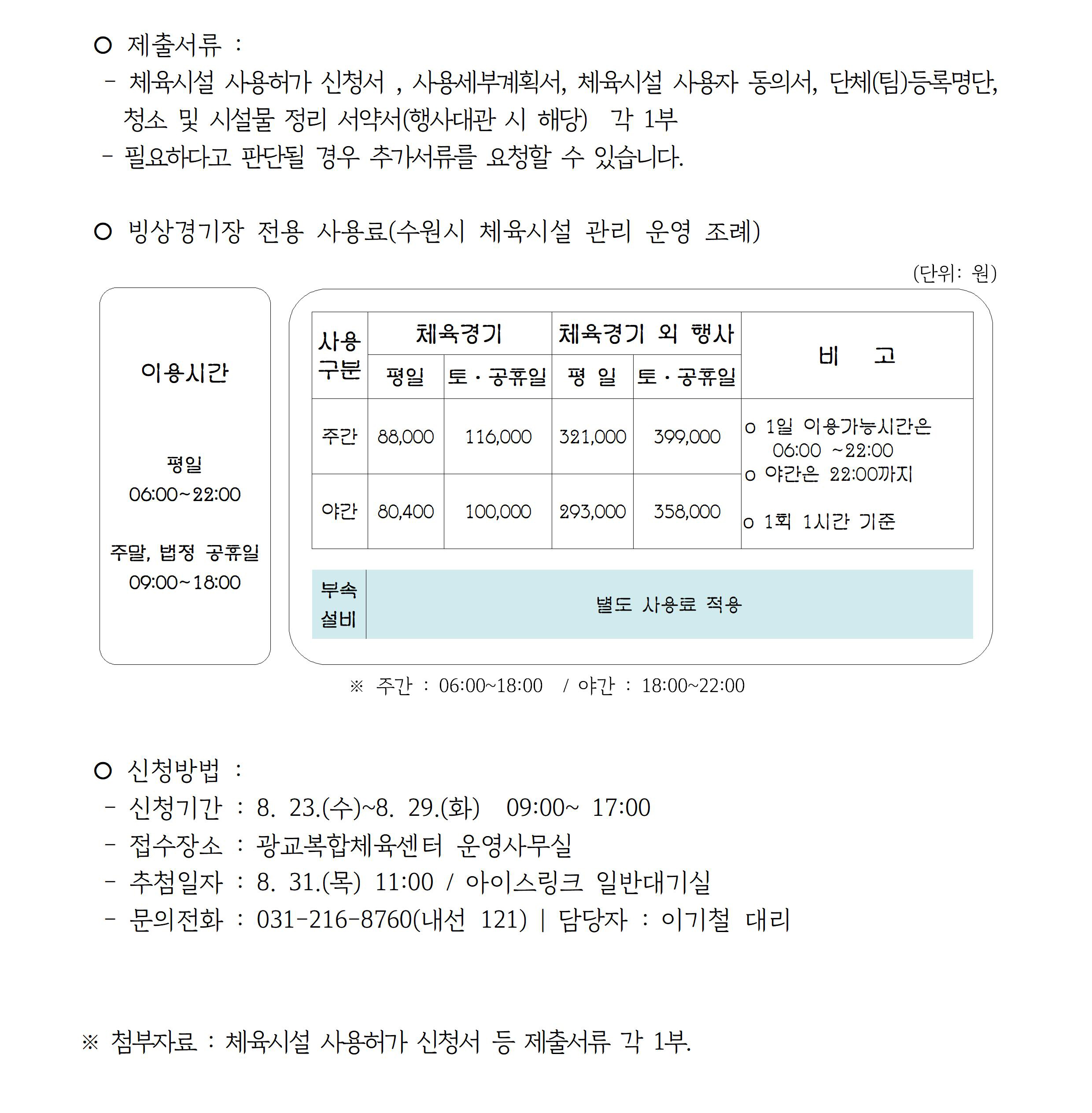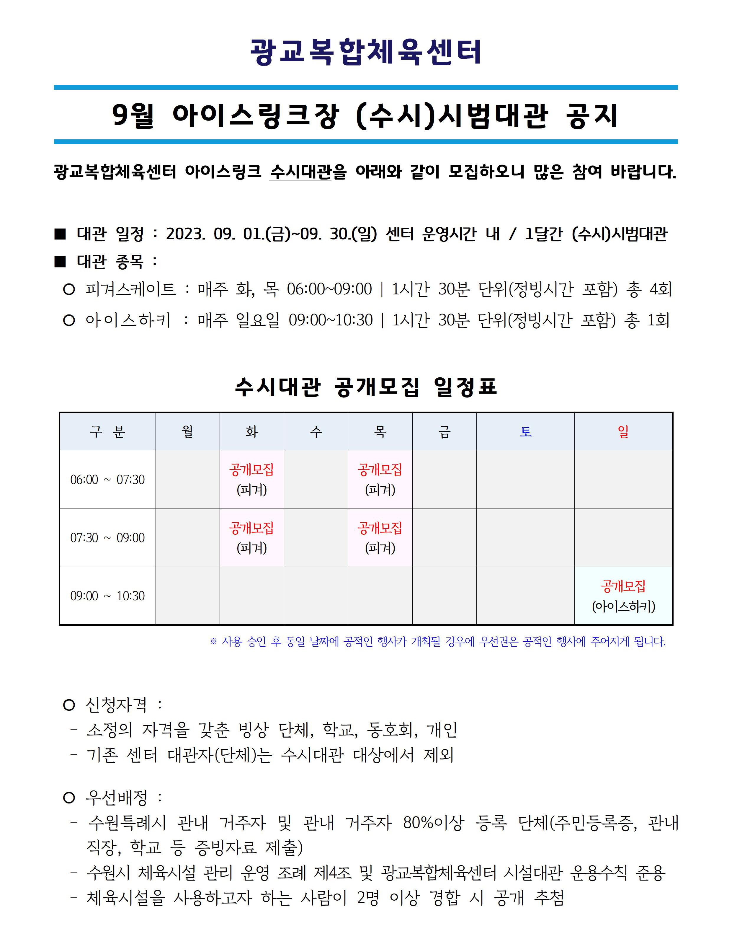 9월 아이스링크장 (수시)시범대관 공지 작성자 관리자 등록일자 2023년 8월 23일 16시 50분 53초 조회 1,398 ('23.09.) 아이스링크 수시대관_공지사항001.jpg [ Size : 1.71MB , Down : 1,565 ] 미리보기 다운로드 ('23.09.) 아이스링크 수시대관_공지사항002.jpg [ Size : 1.55MB , Down : 1,437 ] 미리보기 다운로드 ('23.09.) 아이스링크 수시대관_신청서.pdf [ Size : 173.86KB , Down : 787 ] 다운로드 목록보기