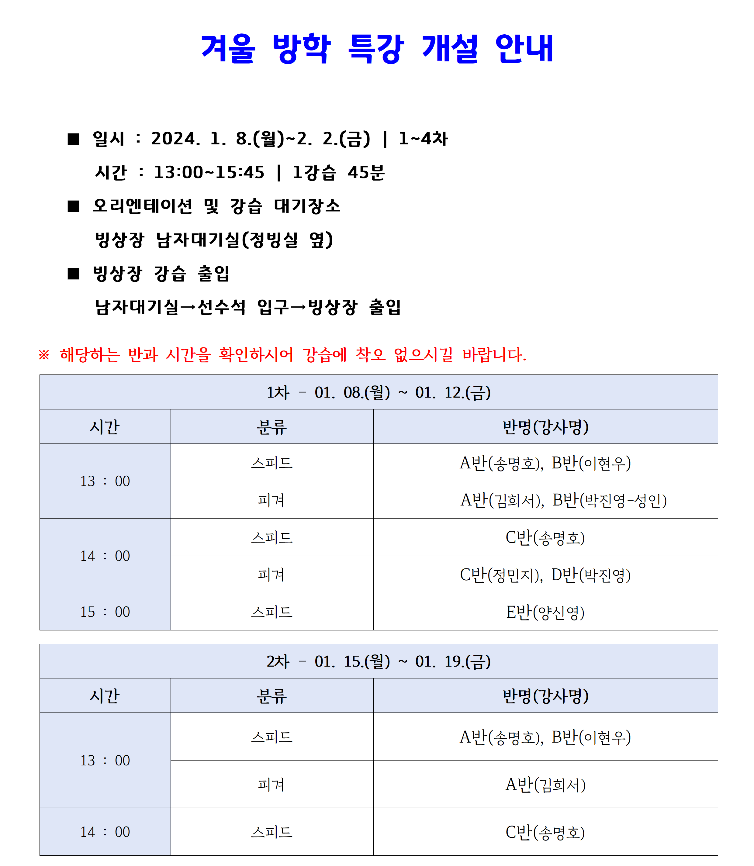 광교복합체육센터 겨울방학 특강 개설반 안내 작성자 관리자 등록일자 2024년 1월 3일 16시 7분 58초 조회 3,271 겨울방학특강 1차~4차 운영 시간(공지용)001.png [ Size : 215.43KB , Down : 4,175 ] 미리보기 다운로드 겨울방학특강 1차~4차 운영 시간(공지용)002.png [ Size : 78.27KB , Down : 4,009 ] 미리보기 다운로드 목록보기