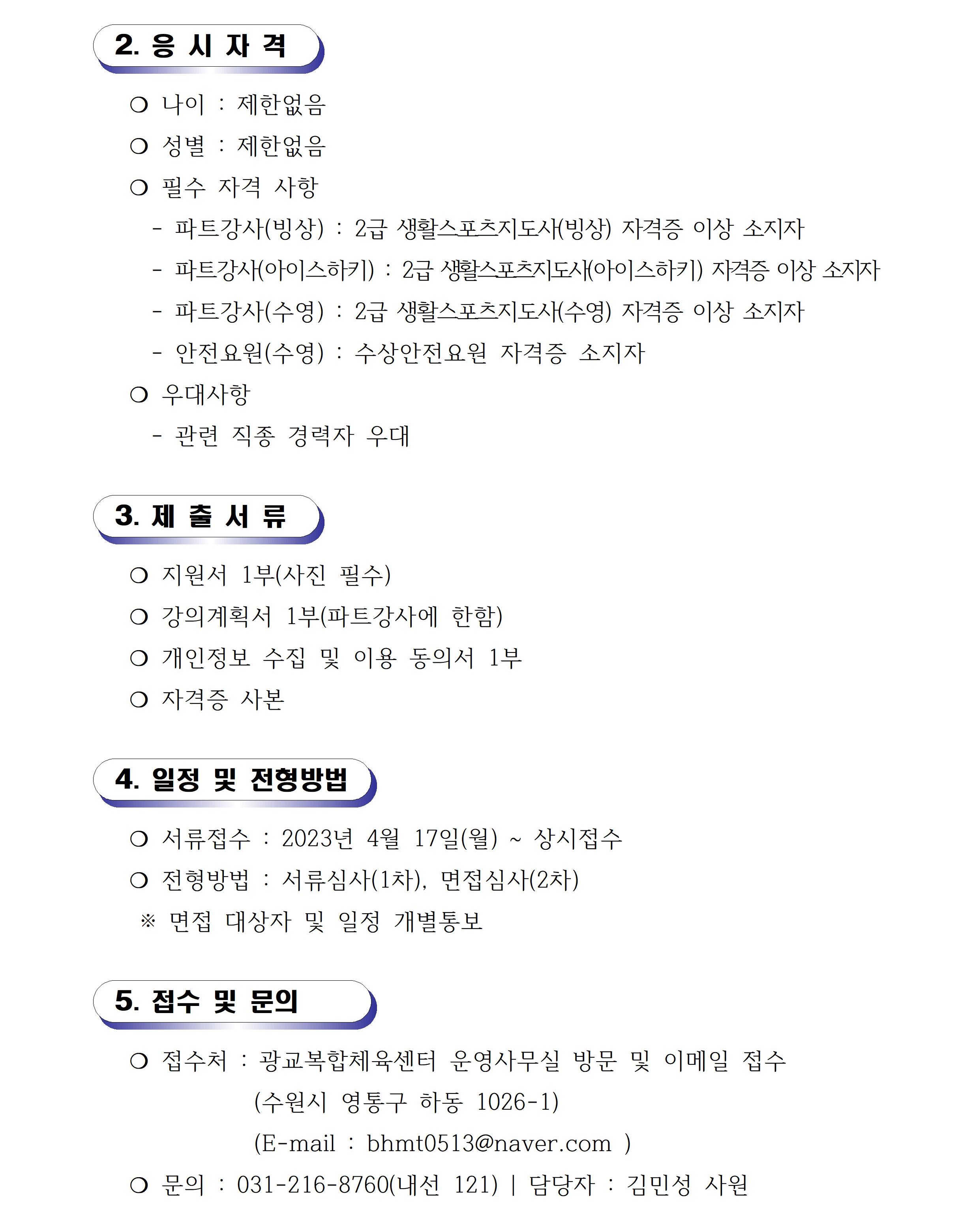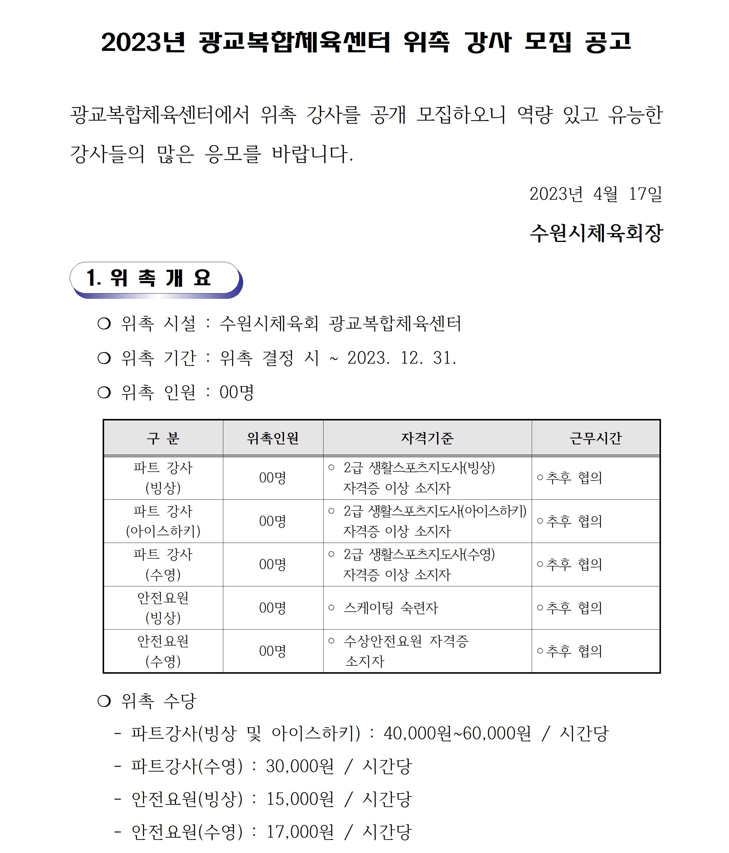 광교복합체육센터 위촉 강사 모집 공고 작성자 관리자 등록일자 2023년 4월 17일 10시 41분 57초 조회 2,570 2023.04.17. 수영_피겨 파트강사 제출서류 양식.hwp [ Size : 46.5KB , Down : 894 ] 다운로드 2023.04.17. 수영_피겨 파트강사 위촉 공지001.jpg [ Size : 631.04KB , Down : 1,969 ] 미리보기 다운로드 2023.04.17. 수영_피겨 파트강사 위촉 공지002.jpg [ Size : 603.01KB , Down : 1,910 ] 미리보기 다운로드 목록보기